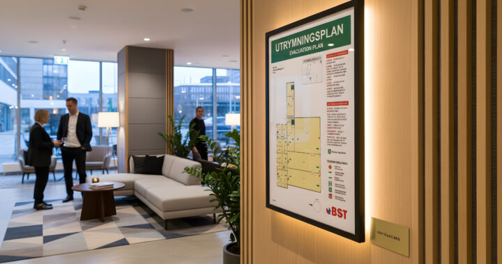- AFS 2023:12 – Arbetsplatser: utrymningsplan ska finnas i den omfattning som behövs och vara väl synlig. Planen ska visa utrymningsvägar (inkl. tillfälliga), återsamling, larmrutiner samt placering av släck- och larmutrustning. Tillgängliga utrymningsvägar för personer med nedsatt rörelse/orienteringsförmåga ska framgå.
